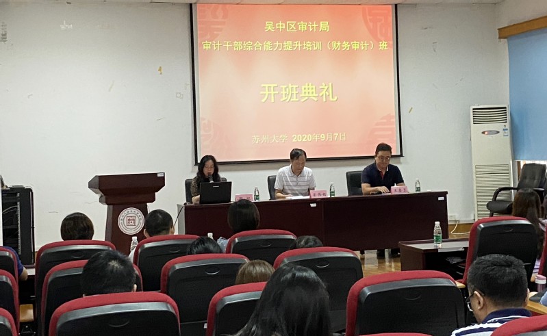 2020年9月7日上午,由吴中区审计局主办、苏州大学东吴商学院(财经学院)和经管培训学院共同承办的“吴中区审计干部综合能力提升培训(财务审计)班”举行了开班仪式,吴中区审计局副局长荣伟铭和苏州大学东吴商学院副院长王要玉出席了开班仪式。