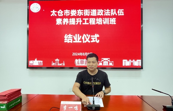 在结业仪式上,学员们通过观看视频对本次培训进行回顾总结。太仓市娄东街道社会治理办公室副主任李一鸣在结业仪式暨娄东街道政法强基工程社会实践项目启动仪式上作了讲话。我们围绕基层社会治理、政治安全、扫黑除恶三个板块听取了四堂专题讲座,相信大家一定有所感悟,有所收获。他借此机会向各位学员们提几点要求并对强基工程后续安排做个简单说明:一要学思结合有担当,砥砺奋进强动能:“学而不思则罔,思而不学则殆”;二要学以致用有提升,奋楫笃行惠民生:“苔花如米小,也学牡丹开”;三要真抓实干有作为,开拓创新启新篇:“民生无小事,枝叶总关情”。