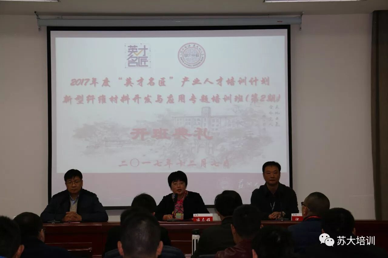 2017年12月7日上午,由江苏省经济和信息化委员会主办,苏州大学承办,2017年度江苏省“英才名匠”产业人才培训——新型纤维材料开发与应用专题培训班(第二期)开班典礼在继续教育学院培训中心101举行。苏州大学纺织与服装工程学院潘志娟院长、纺织与服装工程学院王祥荣副院长、继续教育学院培训科沈晔科长出席了开班典礼,开班典礼由苏州大学纺织与服装工程学院副院长王祥荣主持。