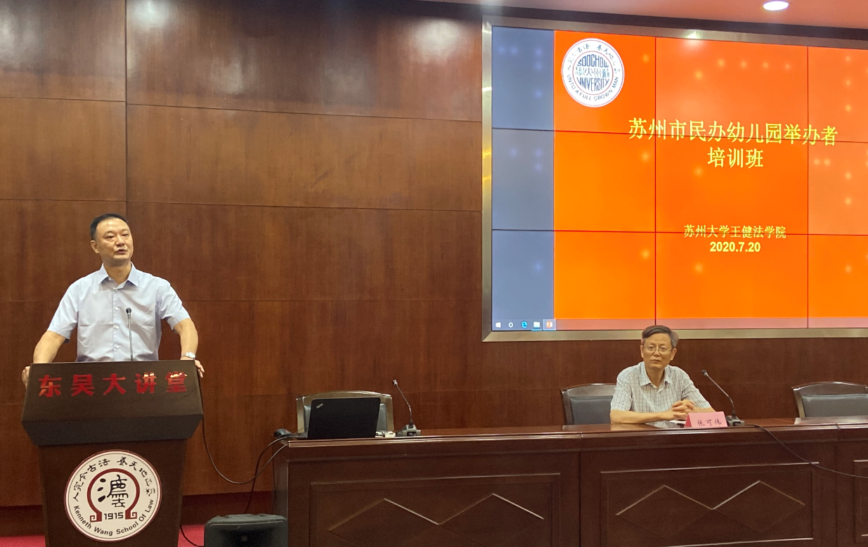 7月20日,苏州市民办幼儿园举办者培训班在我校王健法学院东吴大讲堂顺利开班。原苏州市教育局语言文字与继续教育处张可伟处长,苏州大学王健法学院副院长沈晔出席开班典礼。