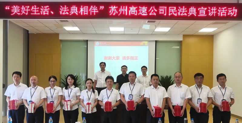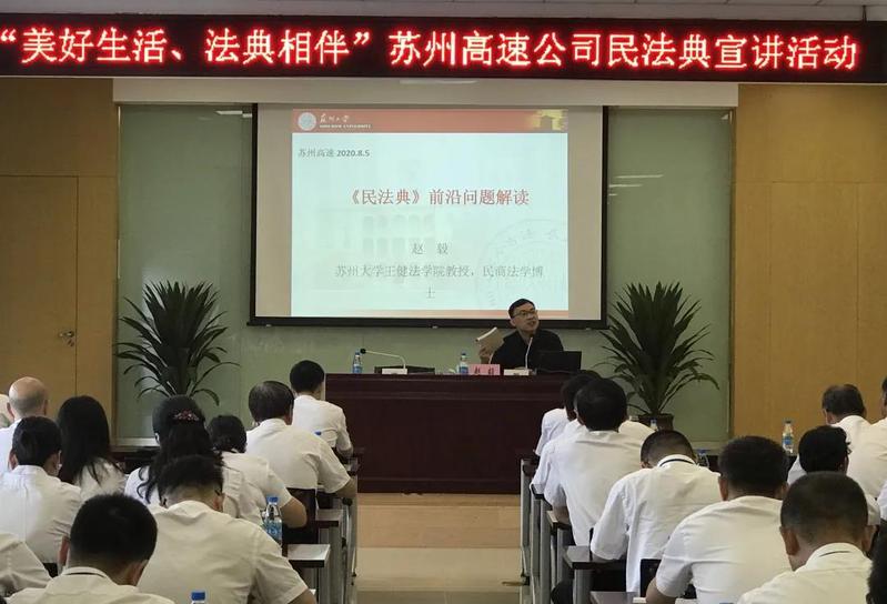为进一步提高企业员工对《民法典》相关法律法规的知晓度,增强员工法治观念、守法意识,教育员工依法更好地维护公司和个人的合法权益,我校提供送教上门服务, 8月5日上午在苏州高速公司四楼多功能厅举办了主题为“美好生活,法典相伴”的民法典宣讲活动。该公司领导、各职能部门和分子公司办事员以上人员,以及各站区队负责人共计120人参加了本次活动。