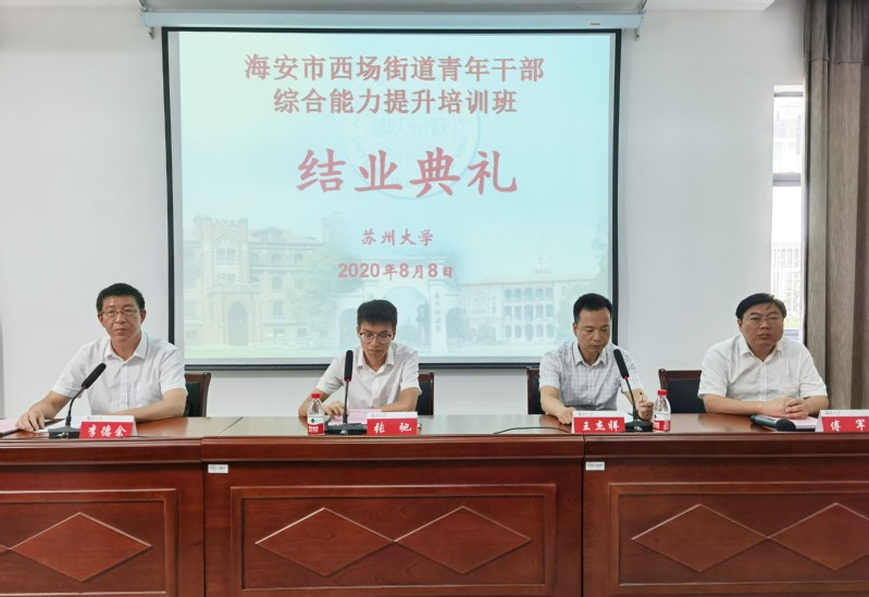 为提升海安市西场街道青年干部的综合素能,8月5日下午,海安市西场街道青年干部综合能力提升培训班在我校天赐庄校区培训中心102教室顺利开班。海安市西场街道党工委副书记、办事处主任陈方明,海安市西场街道党工委副书记李德余,西场街道党工委委员、政法委员傅军,苏州大学金螳螂建筑学院副院长王杰祥出席开班仪式并分别讲话,来自海安市西场街道的35名青年干部出席了开班仪式。