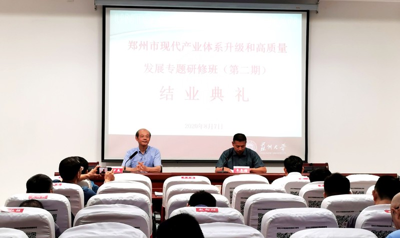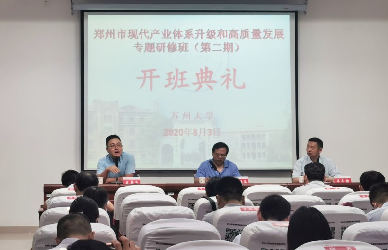 8月3日上午,第二期郑州市现代产业体系升级和高质量发展专题研修班在我院顺利开班。郑州市发展改革委党组成员朱巨亚,郑州市发展改革委副调研员平年佑,苏州大学东吴商学院(财经学院)副院长王要玉等领导出席开班仪式。