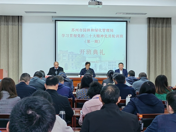 4月3日至4日,由苏州大学承办的苏州市园林和绿化管理局学习贯彻党的二十大精神党员轮训班(第一期)在我校顺利举办。来自园林系统的62名党员参加了本期培训。苏州市园林和绿化管理局党组成员、副局长华益明,苏州大学马克思主义学院院长田芝健,副院长茆汉成出席了开班典礼。