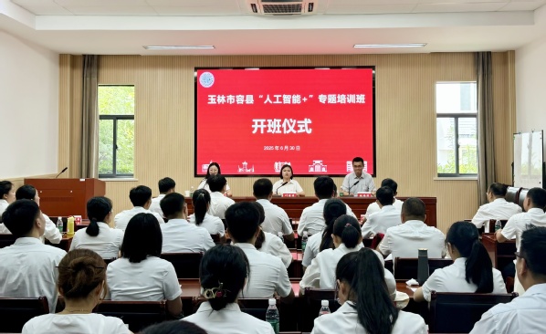 梅雨余韵,蝉鸣穿廊。6月30日,玉林市容县“人工智能+”专题培训班在我校顺利开班,来自玉林市容县县直机关、人工智能发展相关部门的54名中青年干部参加了本次培训。 玉林市容县党员教育中心主任叶俊秀,苏州大学管理培训学院副院长林焰清出席了开班仪式,仪式由苏州大学管理培训学院二中心项目负责人徐年莲主持。