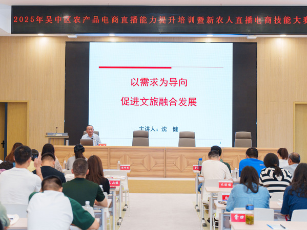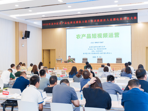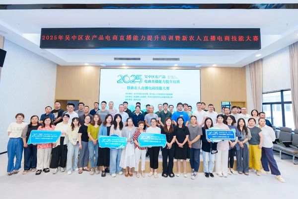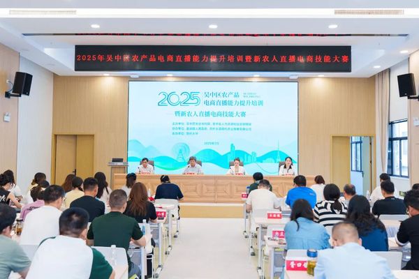 为加速推进吴中区农产品电子商务高质量发展,提升新农人电商运营实战能力,7月31日至8月1日,由吴中区农业农村局、区人力资源、社会保障局和苏州大学联合主办的吴中区农产品电商直播能力提升培训暨新农人直播电商技能大赛在临湖镇优质农产品直播基地成功举办。由吴中各镇、街道及区农发集团遴选的101名农产品电商从业人员参与培训。经过前期孵化选拔,最终8支直播队伍脱颖而出,同台竞技,现场掀起“数商兴农”实践热潮。