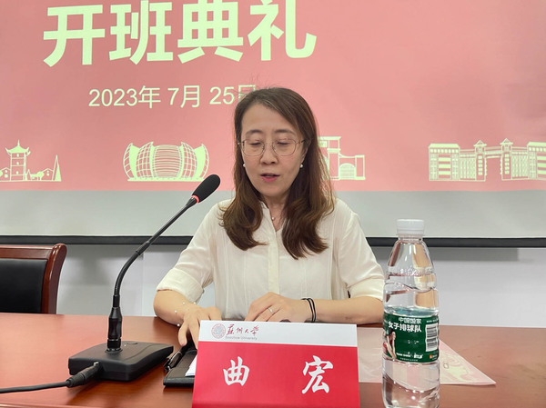 曲宏对全体学员的到来表示热烈欢迎。她向学员们介绍了苏州大学的三个发展阶段:拥有多个“之最”的“东吴大学”阶段、苏州大学融合发展及飞速跨越阶段、全面深入推进教育国际化进程的阶段。她表示,我校将聚焦培训需求,充分发挥我校在教育培训领域的突出优势,持续做好高水平培训服务工作。她希望学员们通过此次培训能够学有所获,将所学运用到工作实践中,全面提升自身的综合素质。