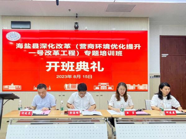 为进一步优化营商环境,提升推进“一号改革工程”进程,8月15日,由苏州大学承办的“海盐县深化改革(营商环境优化提升一号改革工程)专题培训班”在我校顺利开班。来自海盐县委办、县委改革办及海盐县政务数据办的62位领导、负责人参加了此次培训。海盐县委办副主任、县委改革办常务副主任徐海明,海盐县政务数据办主任许进虎,苏州大学管理培训学院副院长曲宏出席了开班仪式。