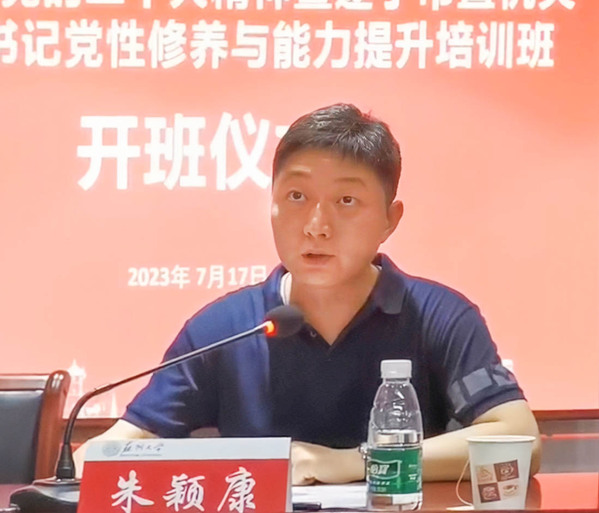朱颖康首先对全体学员的到来表示欢迎。他向学员们介绍了苏州大学的百年发展历程,并为大家介绍了我校在学科建设、人才培养、科学研究等方面取得的优异成绩。同时,他还向学员们介绍了苏州的历史文化与经济发展情况,希望学员们在学习之余也可以领略苏州古城的钟灵毓秀。他表示,我校将聚焦培训需求,为学员们搭建好提升自我的知识平台,希望学员们通过此次培训能够学到新知识、汲取新经验,更好地为人民服务。最后,他预祝此次培训圆满成功。