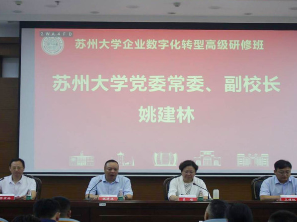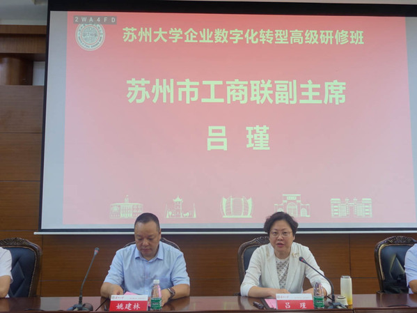 8月26日,由苏州大学和苏州市工商联联合举办的首期“苏州大学企业数字化转型高级研修班”在我校法学院西式模拟法庭顺利开班。苏州市工商联副主席吕瑾,苏州大学党委常委、副校长姚建林,苏州大学继续教育学院院长缪世林、副院长王建凯,苏州大学原机关党工委书记蒋剑平,往期学员代表:溧阳商会会长窦保华、河南商会会长夏广兵,以及首期研修班40位企业家出席开班仪式,仪式由缪世林主持。
