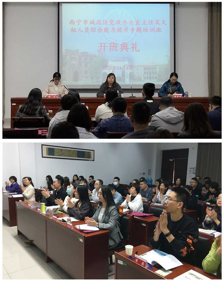 2020年11月4日--11月8日,我校迎来了西宁市城北区党政办公室主任及文秘人员综合能力提升专题培训班的43位学员。西宁市城北区委办公室副主任董永霞、苏州大学干部培训学院副院长张鑫华参加开班仪式并分别讲话,来自西宁市城北区党政办公室主任及文秘人员出席了开班仪式。