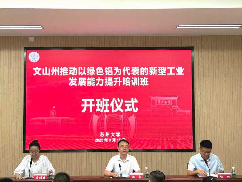 为立足文山州发展大局,着眼绿色铝产业长远竞争力提升。9月15日,文山州推动以绿色铝为代表的新型工业发展能力提升培训班在我校顺利开班。此次培训来自文山州(县)相关部门铝产业发展战线上的领导和业务骨干共51名,文山州人民政府副秘书长、办公室党组成员沈良、苏州大学管理培训学院副院长杨炯出席开班仪式。