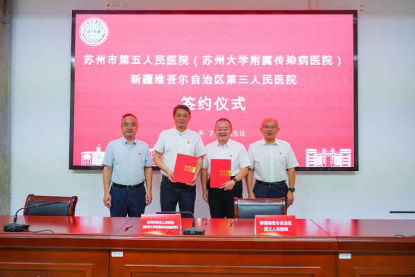 随后,苏州市第五人民医院(苏州大学附属传染病医院)与新疆维吾尔自治区第三人民医院进行签约仪式,签署了合作协议。苏州市第五人民医院(苏州大学附属传染病医院)院长张钧与新疆维吾尔自治区第三人民医院院长杨成新表示,双方将通过专科共建、教育培训协同合作、科研项目协作等多种方式,双向促进职业病相关学科医疗服务能力和管理水平,在未来的建设与发展中,形成良好的互助共进关系。