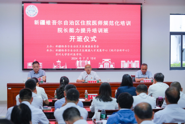 7月15日,新疆维吾尔自治区住院医师规范化培训院长能力提升培训班开班仪式在我校举行。新疆维吾尔自治区卫生健康委员会党组副书记、主任于爱平,苏州大学党委常委、副校长查佐明,新疆维吾尔自治区卫生健康委员会科技教育处副处长(主持工作)丁蕾,新疆维吾尔自治区卫生健康委员会科技教育处副处长聂继华,新疆维吾尔自治区卫生健康委员会人才发展中心主任朱文静,苏州大学管理培训学院副院长宋军出席开班仪式。开班仪式由苏州大学苏州医学院党工委书记钱福良主持。