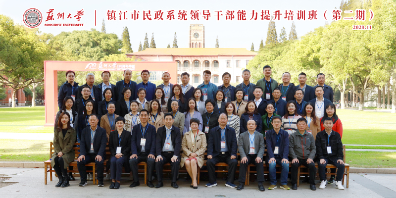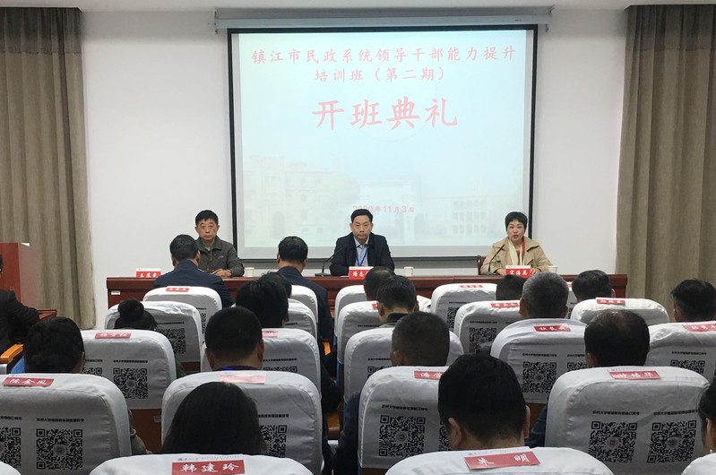 2020年11月3日下午,镇江市民政系统领导干部能力提升培训班(第二期)在我校举行开班仪式。镇江市民政局党委委员、四级调研员潘志坚、苏州大学传媒学院党委副书记宋海英、苏州大学干部培训学院调研员王苏光出席开班式。