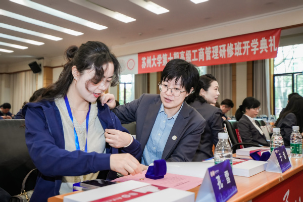学员们在开学典礼上集体佩戴苏州大学纪念章,寓意着苏州大学精神的传承,也代表了从此刻开始成为一名苏大人。学员今后将依托苏州大学及商学院的平台,承担使命与担当,发扬新时代企业家精神,勇于拼搏进取,为实现中华民族伟大复兴的中国梦贡献自己的力量。
