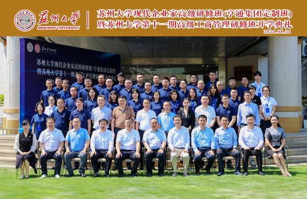 凝心聚力,扬帆起航。8月24日,苏州大学现代企业家高级研修班(亨通集团定制班)暨苏州大学第十一期高级工商管理研修班在苏州大学商学院二楼报告厅顺利开班。苏州大学党委常委、副校长姚建林,苏州大学商学院党委书记刘志明,亨通集团管理学院院长李谷村,安孚创始人/董事长孙宇光,苏州大学商学院经管培训学院副院长缪爱国,高管教育培训中心主任汪晓媛,企业定制培训中心主任王丹萍,副主任于音及历届学员代表共同出席此次开学典礼。本次开学典礼由苏州大学商学院经管培训学院副院长缪爱国主持。