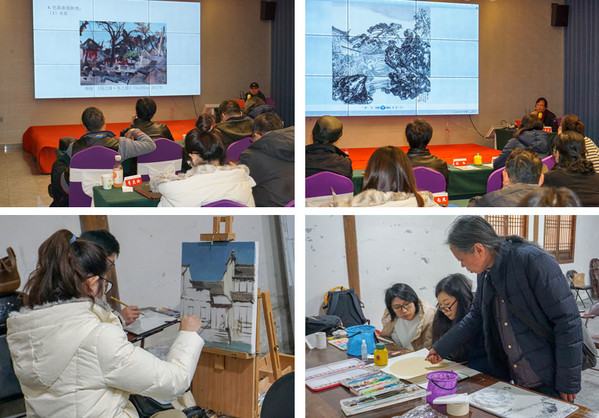 开班典礼结束后,姜院长以自己作品来举例讲解,开启了第一课《悠然匆匆,走走画画》。当天下午,姜院长带领学员们到甪直古镇采风,鼓励学员珍惜培训时光,多交流,多画画。