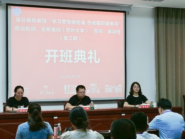 9月19日上午,由苏州大学承办的灌云县检察院“学习思想铸检魂 忠诚履职建新功”政治轮训、业务培训(苏州大学)“双训”培训班(第二期)在我校顺利开班。来自灌云县检察院的约45名干警参加了此次培训。灌云县人民检察院党组成员邵晖,灌云县人民检察院党组成员张莉云,苏州大学管理培训学院副院长黄艳凤出席了此次开班典礼。