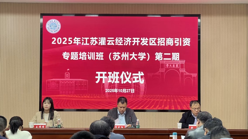 10月27日,2025年江苏灌云经济开发区招商引资专题培训班(苏州大学)第二期在我校顺利开班,来自江苏灌云经济开发区的30余名党政干部参与此次培训。江苏灌云经济开发区党工委委员、纪工委书记季龙飞,苏州大学传媒学院党委书记张健出席开班仪式。