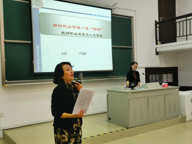 10月21日-10月31日,来自江苏省各中职院校的30名学员齐聚苏大参加研修。尹艳秋教授讲授第一课 “教师的职业道德和人文修养”,希望大家能做一名“有理想信念,有道德情操,有扎实知识,有仁爱之心”的四有教师。查佐明副教授讲授第二课“党性修养专题”。用许多与主题相关的视频和最新的实时政治来丰富课堂的内容。