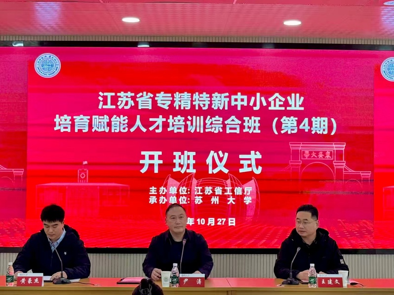 10月27日下午,江苏省专精特新中小企业培育赋能人才培训综合班(第4期)在我校顺利举办。来自江苏省的企业家代表团参加了此次培训,江苏省工信厅服务体系建设处副处长尹涛,苏州大学管理培训学院副院长、培训部主任王建文出席开班仪式。