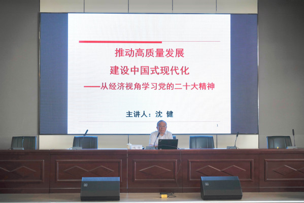 沈健从“经济视角的党的二十大精神学习要点”“我们面临的经济压力与风险”“中国式现代化的主要特征与发展目标”等方面,详细讲述了中国新时代十年的伟大变革、取得的重大理论成就和伟大实践成就;细致解读了当前的经济形势并重点讲授了以高质量发展引领中国式现代化必须把握的重要原则。最后,他指出,推动经济高质量发展取得新突破,实现经济实力、科技实力、综合国力的大幅跃升,不断夯实物质技术基础,已经成为中国式现代化进程的本质要求和面临的首要任务。开启充满光荣和梦想的远征,穿越百年依然风华正茂的中国共产党,必将团结带领勤劳智慧的中国人民,坚定历史自信、把握时代大势、走好中国道路,以高质量发展绘就新的宏伟图景,推动中国经济航船行稳致远。