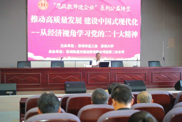 11月3日,由苏州市总工会、苏州大学共同推出的“思政教师进企业”系列苏州工会网上学院公益讲堂第九期在苏州轨道交通运营有限公司运营二分公司举行。苏州大学沈健教授进行《推动高质量发展 建设中国式现代化——从经济视角学习党的二十大精神》主题宣讲,苏州市轨道交通集团有限公司运营二分公司党委副书记、纪委委员、工会主席宋敏主持并全程参与此次活动,共有50余名员工聆听了讲座。