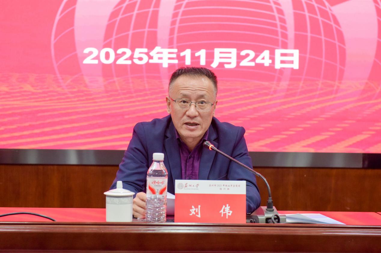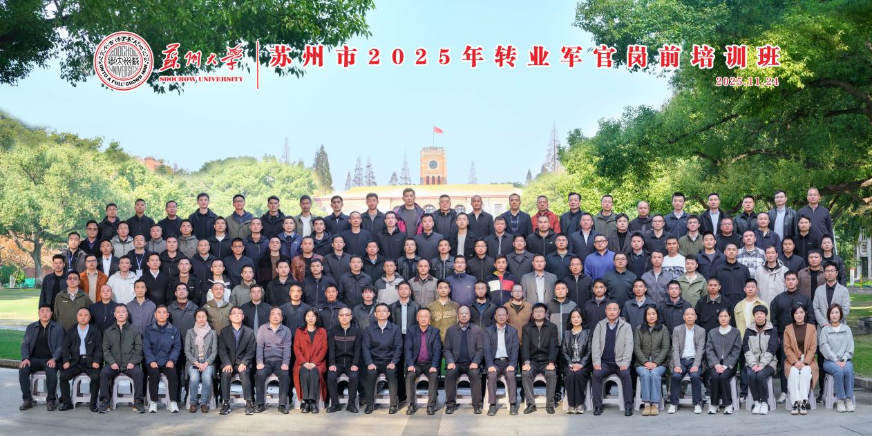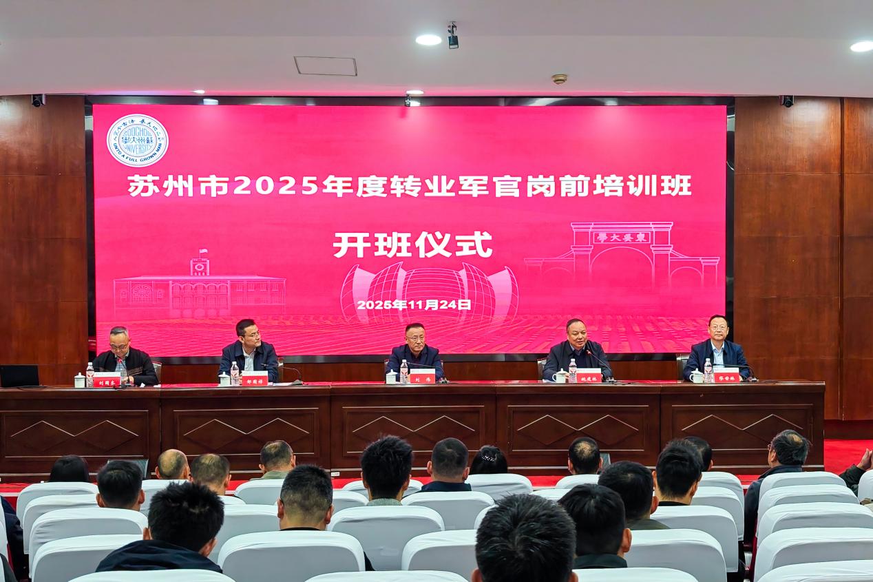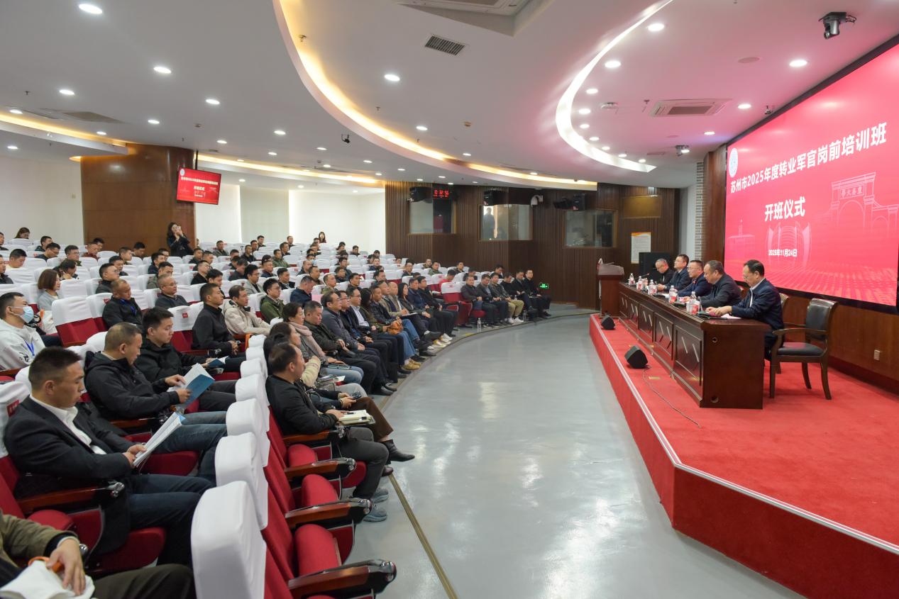 2025年11月24日,苏州市2025年度转业军官岗前培训班在我校顺利开班,来自苏州市各地的116名转业军官参加了此次培训。苏州市退役军人事务局副局长刘伟,中共苏州市委组织部干部一处处长邹国祥,苏州市退役军人事务局移交安置处处长刘国齐,苏州大学校党委常委、副校长姚建林,退役军人事务培训学院院长缪世林出席开班仪式。