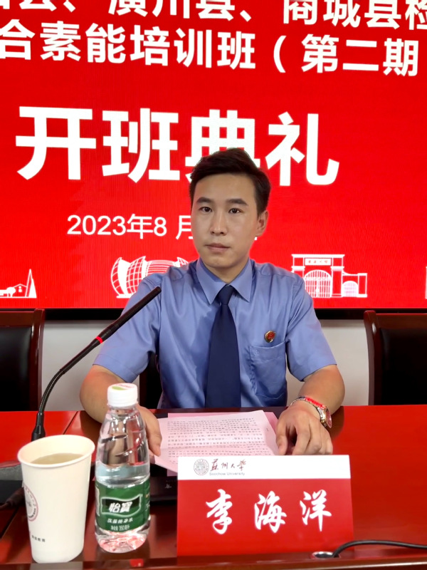 李海洋作动员讲话。他首先感谢苏州大学对此次培训给予的支持与帮助,希望学员们在学习期间能够学有所思、思有所悟、悟有所获。随后他向学员们提出了具体要求:一要提高思想认识,增强学习自觉性;二要端正学习态度,确保学习实用性;三要严格自我要求,保证学习严肃性。最后,他表示,培训是短暂的,学习是终身的,希望学员们珍惜学习机会,在苏州实现充电加油的同时,把苏州大学“养天地正气,法古今完人”的校训和“自由开放,包容并蓄,追求卓越”的校风带回单位,融入日常工作,不断提升自身的能力素质和工作水平。