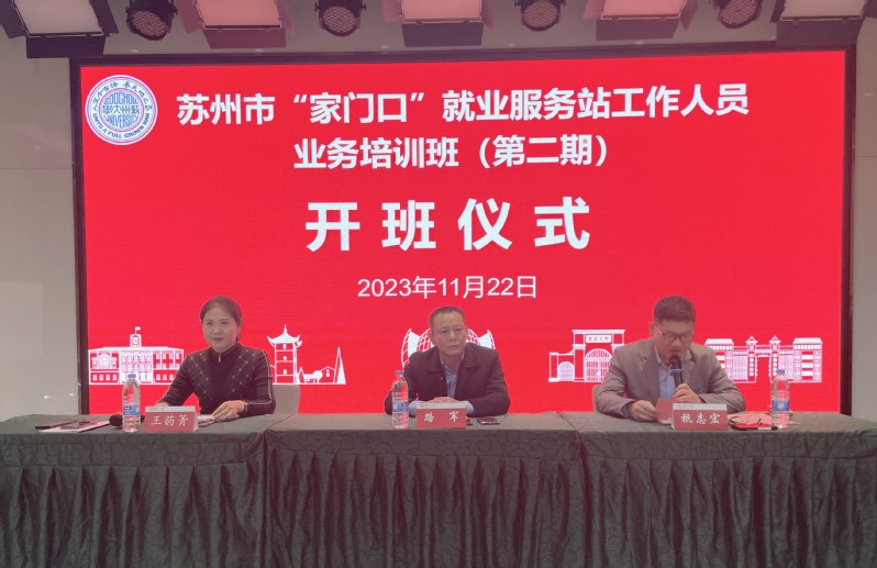 11月22日上午,由苏州大学承办、苏州市劳动就业管理服务中心主办的苏州市“家门口”就业服务站工作人员业务培训班(第二期)在吴江东太湖亚朵酒店顺利开班。来自苏州市下辖姑苏、新区、吴中、相城、吴江5个区和苏州工业园区以及常熟、张家港、昆山、太仓4个县级市“家门口”就业服务站的工作人员共61人参加了此次培训。苏州市劳动就业管理服务中心副主任路军,苏州大学管理培训学院副院长杭志宏出席了开班仪式。