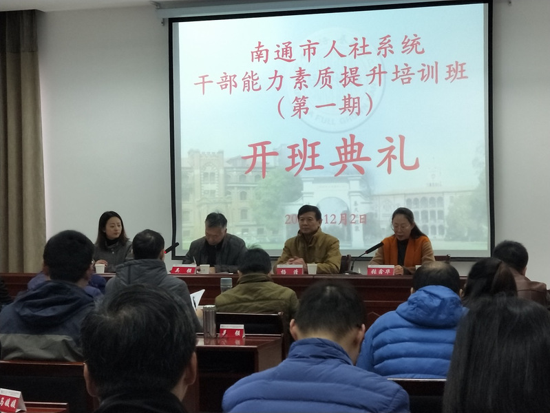 12月2日至12月6日,南通市人社系统干部能力素质提升培训班(第一期)在我校本部培训中心103教室顺利举办。来自南通市工伤保险基金管理中心、南通市人事考试中心、南通市劳动就业管理中心、南通市社会保险基金管理中心、南通市人才服务中心的68位领导干部参加了此次培训。南通市劳动就业管理中心党总支书记吴强和我校体育学院党委书记杨清、体育学院副院长张鑫华参加了开班典礼并分别做了讲话,班主任周琴老师主持了开班典礼。