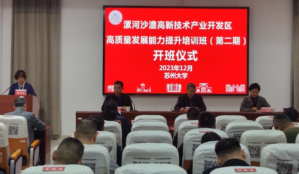 12月10日,由苏州大学继续教育学院承办的“漯河沙澧高新技术产业开发区高质量发展能力提升培训班(第二期)”在苏州大学如期举行。来自开发区综合办、投资促进局、经济发展和科技统计局、规划建设局等各部门负责人共23位学员参加了本次培训。漯河沙澧高新技术产业开发区党工委委员、管委会副主任曹立明,漯河沙澧高新技术产业开发区综合办公室主任郭卫东,苏州大学管理培训学院项目主任卢艳婷出席了开班仪式,仪式由苏州大学管理培训学院班主任杨绮文主持。