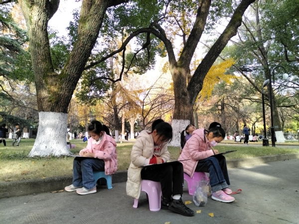 游览结束后就到了深受学员们喜爱的写生绘画环节,在老师讲解、示范结束后,学员们搬上自己的小板凳,在钟楼附近开始寻找自己喜欢的角度,有绘制树木的,有绘制落叶的,还有绘制建筑的,丝毫不受来往人群的影响,在沙沙的树叶声中完成自己的作品。