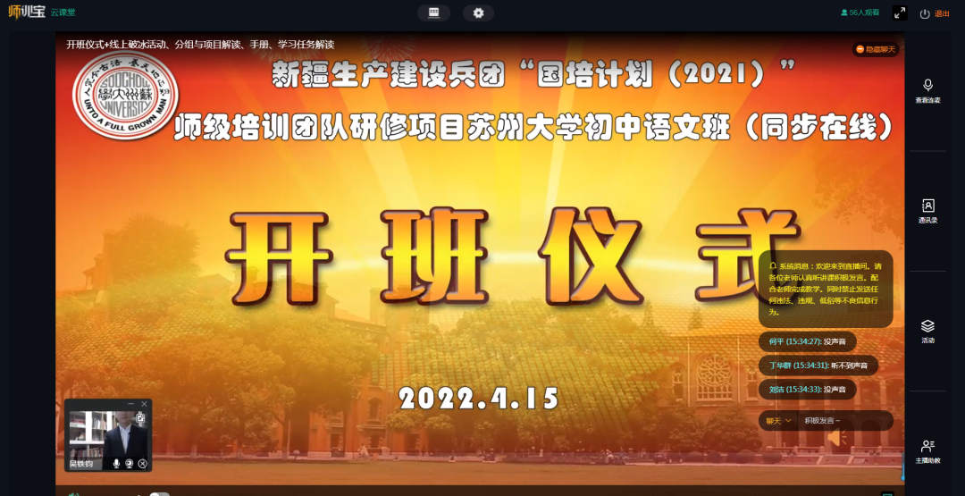 4月15日,来自新疆生产建设兵团的50位初中语文骨干教师齐聚云上苏大,开启国培线上研学之旅。新疆生产建设兵团教育科学研究院教研员李旻,苏州大学教育学院副院长、教师培训学院执行院长吴铁钧及全体学员参加了此次线上开班仪式。仪式由吴铁钧院长主持。