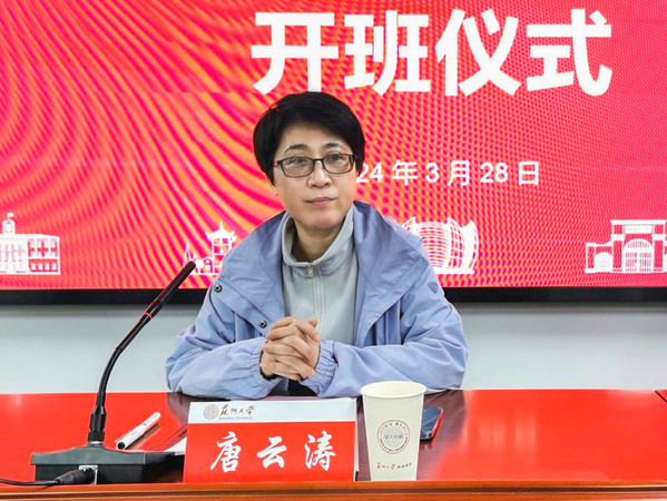 唐云涛作开班动员讲话。她首先对苏州大学的大力支持与精心安排表示感谢。她强调,政贵在行,事成于实。要实现“制造立市、文旅兴城”战略,落实是关键,希望各位学员以本次培训为契机,突出重点学,联系实际学,追求实效学,学习苏州在园区建设、营商环境、区域经济发展等方面的先进经验,进一步增强工作的系统性、预见性和创造性。