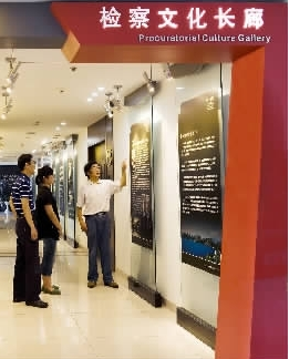 检察文化长廊位于园区检察院四楼,这以《百年检察史法治民主路》为主题的检察文化长廊面积约100平方米,共分15张展板,用大量的文物、图片、档案资料,配以精练的文字介绍,集中展示了百年检察的风雨历程。