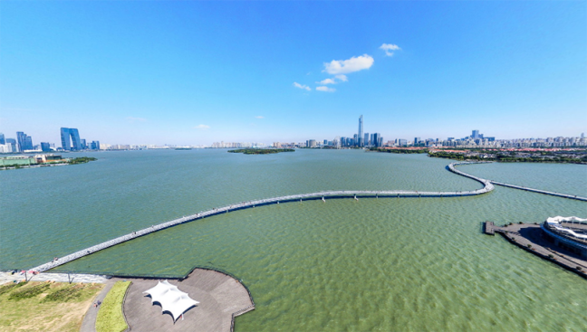 自2018年10月1日起,环金鸡湖步道正式全面对外开放,总全长约14公里,该项目在已建成的环湖公共空间中改造和提升,沿水岸建成包括路径、节点及配套设施的步道系统,新建了玲珑湾(凤凰泾桥)、金水湾栈桥、中茵皇冠栈桥、艺术中心桥、中塘河桥5座桥梁,并在玲珑湾、风之园、小金鸡湖湿地等按新设计进行景观提升和改造。新建及拓宽的步道宽以4-6米为主,铺面以花岗岩为主、增加了标识牌、座凳、廊架等便民设施,并且沿途设置了遮荫点可供休息。