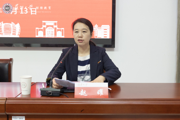 赵曜致欢迎辞,她首先对参加本次培训的学员表示热烈欢迎,并向学员介绍了苏州的区域优势、人文优势、经济发展状况,从“长度、宽度、高度、深度、温度”五个方面介绍了苏州大学的改革发展历程、学科建设成果和办学优势。她表示我校将依托雄厚的培训讲师团队,努力为学员们提供良好的学习平台,希望各位学员能够不虚此行,学有所获、学以致用。最后,她预祝此次培训取得圆满成功,各位学员在苏学习期间一切顺利。