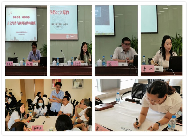 受疫情影响,此次培训采用送教形式开展。在为期两天的特训中,苏州大学文学院党委书记、马克思主义学院教授孙宁华,苏州大学文学院副教授李一,苏州大学传媒学院副教授、新闻学系主任陈一,苏州大学文学博士、苏州大学传媒学院副院长谷鹏通过深入浅出的讲解、绘声绘色的课件、互动讨论、分组课题等新颖形式传授了《新闻宣传的立意与创新》《微传播与工作创新》《法定公文写作实务与交流》《党务公文写作》精彩特训课程,学员们都受益匪浅。