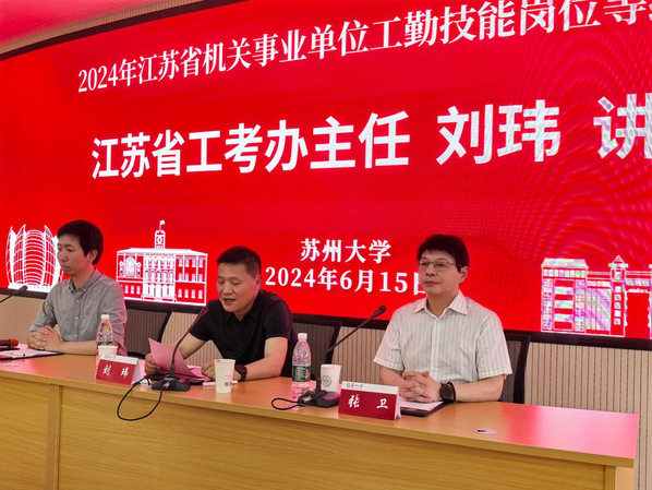 6月15日下午,2024年江苏省机关事业单位工勤技能岗位等级工培训在我校开班。本次培训受江苏省工考办和苏州市人社局委托 ,来自苏州市各机关事业单位的280名学员参与本次培训考核,涵盖行政事务、护理保健、收银审核等10个工种。江苏省机关事业单位工人技术等级岗位考核办公室主任刘玮,苏州市人力资源和社会保障局工资福利处处长杨磊,副处长陆志军,苏州大学产业人才培训学院副院长张卫出席了开班仪式,仪式由苏州大学产业人才培训学院院长助理李琳主持。