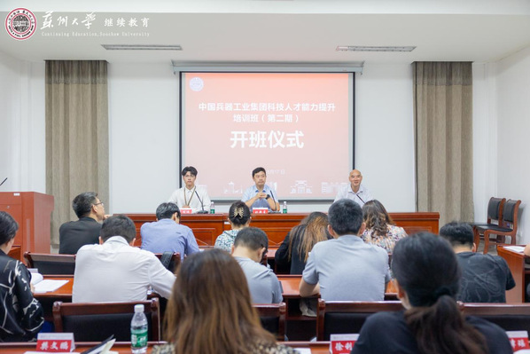 为了贯彻落实中国兵器工业集团人才强企战略部署,进一步提高青年科技骨干履职能力水平,6月17日上午,中国兵器工业集团科技人才能力提升培训班(第二期)在我校顺利开班,来自中国兵器工业集团的25名学员参加了本次培训。中国兵器人才研究院创新力教研部业务主管刘新星,苏州大学管理培训学院副院长茆汉成出席了开班仪式。