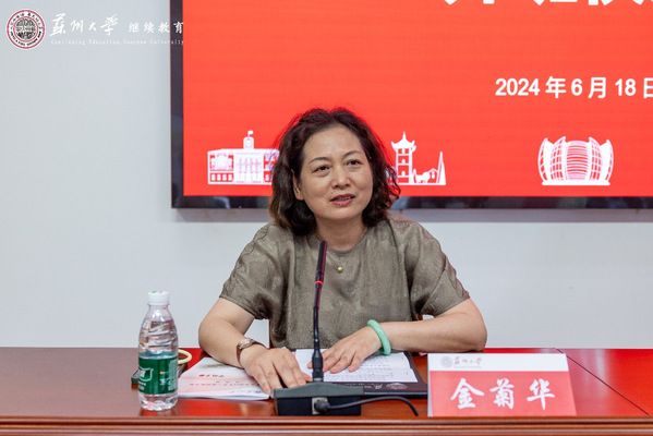 金菊华致欢迎辞。她首先对参加本次培训的学员表示热烈欢迎,并向学员们介绍了苏州大学的百年发展历程,包括在学科建设、人才培养、科学研究以及社会服务等方面取得的成果。她表示,我校将持续做好高水平培训服务工作,以最大的努力为圆满完成本次培训任务做好组织和服务工作,希望各位学员能够不虚此行,学有所获、学以致用。最后,她预祝此次培训取得圆满成功,各位学员在苏学习期间一切顺利。
