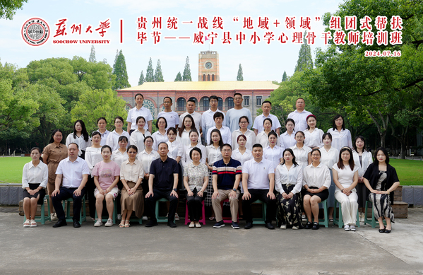 7月16日,苏州大学迎来了一场意义深远的教育盛会——贵州统一战线“地域+领域”组团式帮扶毕节——威宁县中小学心理骨干教师培训班拉开帷幕。来自贵州省毕节市威宁县的40余名中小学心理骨干教师齐聚苏州大学。九三学社中央委员、贵州省政协常委、一级巡视员、九三学社贵州省委专职副主委程绍雨,中共威宁县委常委、组织部部长王涛,以及苏州大学管理培训学院副院长居民出席了开班仪式。