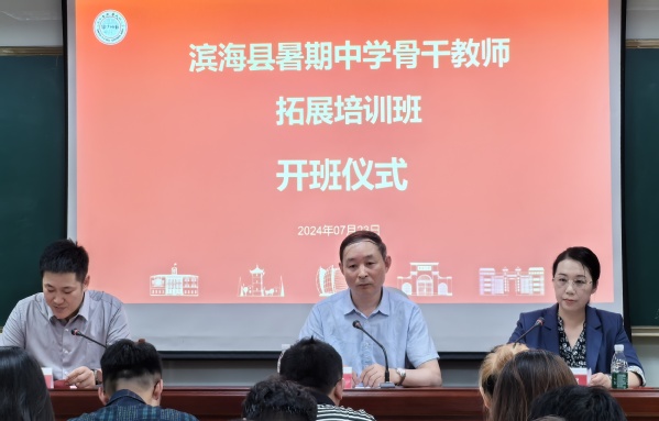 在这万物繁茂、生机勃勃的盛夏时节。7月23日,滨海县暑期中学骨干教师拓展培训班在我校顺利开班。来自滨海县中学骨干教师共50人参加了本次培训。滨海县教师发展中心中小学教师发展科科长沈劲松,苏州大学管理培训学院副院长赵曜,苏州大学管理培训学院培训中心主任徐永出席了开班仪式。