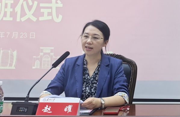 开班仪式上,赵曜代表苏州大学对此次参加培训的学员表示热烈的欢迎。她从五个方面:长度、宽度、深度、高度、温度介绍了苏州大学的百年发展历程及在学科建设、师资力量、人才培养方面的优秀成果。最后她希望学员们能够学有所获、学有所用、学有所成。