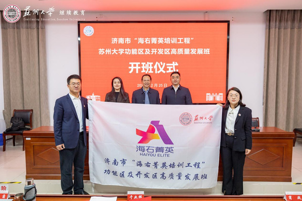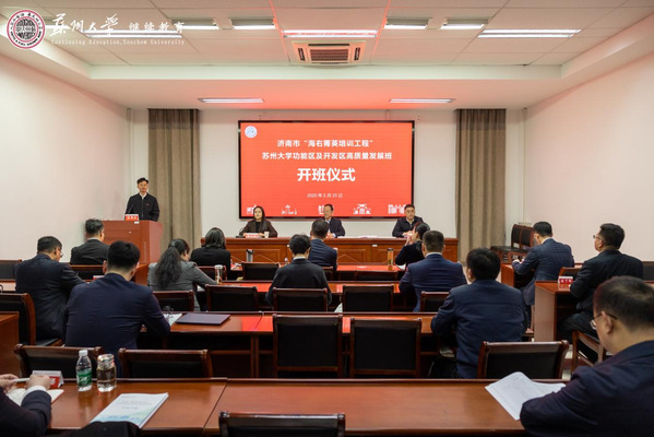 为全面落实开发区高质量发展各项任务,创建繁荣宜居智慧新城,2月25日,济南市“海右菁英培训工程”苏州大学功能区及开发区高质量发展班顺利开班,来自山东省济南市的12位干部参加了此次培训。济南市委组织部干部队伍建设规划办主任庞光亮、苏州大学继续教育学院院长缪世林出席开班仪式。